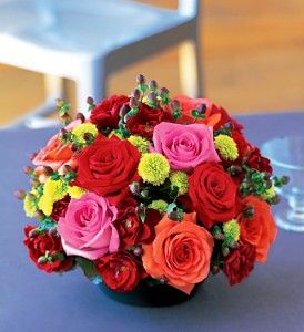Orange, red and pink roses with a touch of chartreuse button chrysanthemums delivered in a round dish