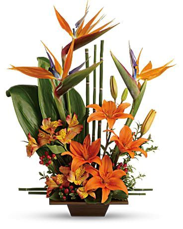 Send good feng shui someone's way with this striking arrangement. Orange flowers, gorgeous green ti leaves and small bamboo-like canes are arranged in a balanced, Zen-like composition
