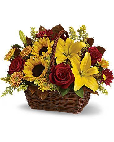 Send warm autumn sunshine to a special friend or relative with this golden gift basket of flowers. Yellow lilies and sunflowers make everyone smile!