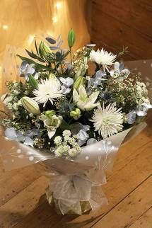 Send some festive elegance with this stunning bouquet of crisp white flowers including Lilies, Bloom Chrysanthemums and Waxflower