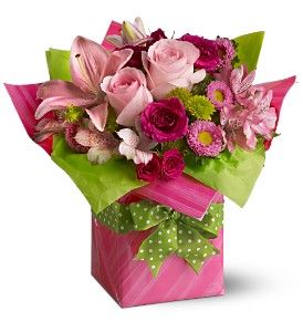 A splendid bouquet of pretty pink blossoms – nestled snugly inside a gift-wrapped box – creates a blooming gift for a birthday or graduation, or a cheerful “Thank you!” present. It’s a unique way to brighten someone’s day