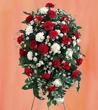 This traditional spray is presented in red and white. Vibrant red carnations blend with white carnations, Monte Casino, and white button pompons. Delivered on an easel Nguoi Viet Contact us at 469-233-4537 for flower delivery Hoa Chia Buon