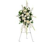 One spray, decorated with white carnations, chrysanthemums and gladioli, is accented with rich green foliage and is delivered on an easel.