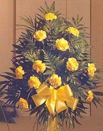 Vibrant yellow carnations accented with a yellow satin ribbon bow all nestled in a bed of delicate greenery is a celebration of the life of your dear friend.