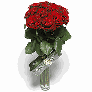 A stunning compact arrangement of 12 Classic Red roses and a box of chocolates.