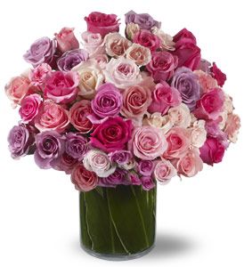 When only the best will do, send all your love this Mothers Day with a magnificent floral arrangement of roses, roses and more roses! Dozens of pink and lavender roses are beautifully arranged in a clear glass vase lined. More than 40 Roses Arranged
