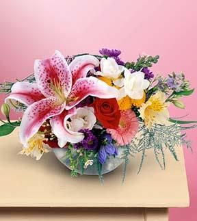You'll be stargazing with this garden full of flowers. Heaven's best lilies, roses, freesia and other blooms are artfully arranged in a glass bowl.