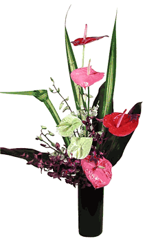 Six of our heart-shaped, long lasting anthuriums in assorted sizes and colors surrounded by six orchid stems and accented with tropical foliage.