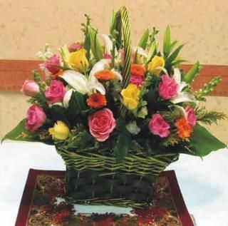 Giỏ hoa gồm ly trắng, phấn hồng, hồng vàng, phăng cam và cỏ phụ