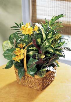 Stems of yellow alstroemeria add sunny color to this basket of assorted green plants