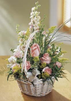 Blushing peach roses and pink larkspur, with more pink, yellow and white blossoms, are sweetly nestled in a handled basket