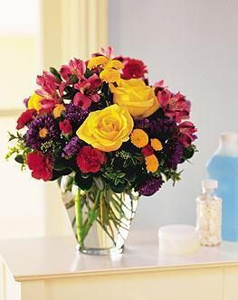 With an abundant array of bright red, yellow and purple flowers, this arrangement is the right remedy for a speedy recovery. Alstroemeria, asters, Rose and chrysanthemums