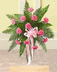 A classic spray of fragrant pink carnations and greenery accented with a delicate pink satin bow is a warm and everlasting symbol of the bonds of affection with your loved one.