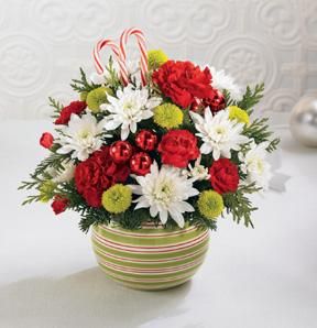 what fun it is! A combination of happy holiday colors - red carnations, white cushion pompons, and green button pompons - frolic in our round ceramic green and white candy-striped bow