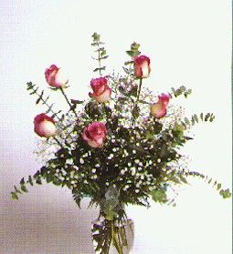 Nothing goes together quite like roses and romance. (Except for you and that special someone.) Six roses grace a clear glass vase filled with Eucalyptus leaves and baby breath