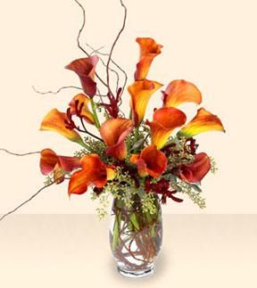 This bouquet offers an unusual pairing. Rust color mini calla lilies