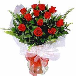 One dozen red roses with greens wrapped with soft silky tissue wrapper