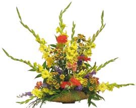 A colorful basket arrangement of gladiolus, carnations, pompons, gerbera and more in yellow, red, purple and bronze