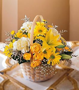 This lovely basket combines a yellow lily, yellow spray roses, yellow daisies and other bright, sunshiny blossoms.