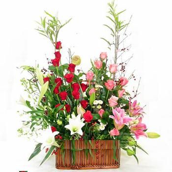 Giỏ hoa bông hồng phấn, bông hồng ðỏ, cành ly hồng nở, bông loa kèn