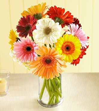 Brighten someone's day with this cheery collection of 12 stems of mixed color gerbera daisies