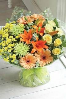 Send a ray of sunshine with this hand-tied bouquet of choice flowers including Roses, Lilies and Gerbera