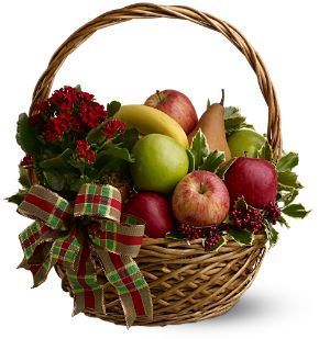 An assortment of fresh fruit such as apples, pears and bananas – plus a blooming flower bouquet – is delivered in a woven basket