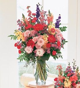 Roses, carnations, gerberas, asters, stock and larkspur arrive in an tall glass vase.