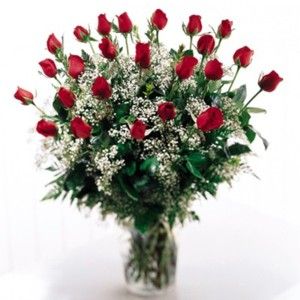 2 dozen roses, enhanced by baby-breath, make a grand entrance in this beautiful arrangement in a glass vase. Sure to impress for any occasion