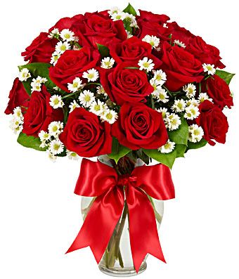 Only one word really comes to mind: Wow! Two dozen red roses take a commanding center stage, complemented by white Monte Casino blooms in a classic urn vase capped off with a red satin ribbon