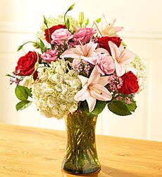 Mixed bouquet of the freshest roses, Asiatic lilies, lisianthus, hydrangea, waxflower and salal. Artistically designed by our select florists in a stylish green glass gathering vase