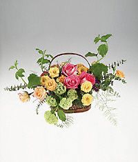 Mixed colorful roses in a basket.
