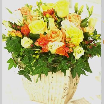 Giỏ hoa bông hồng kem, bông hồng cam, lan tường trắng