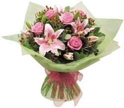 Sản phẩm gồm 3 cành ly, 5 bông hồng và hoa chuỗi ngọc