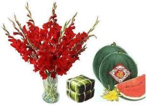 TET GIFTS 2 watermelon 5kg/each 2 rice cake 1kg/each 1 red gladiolius vase