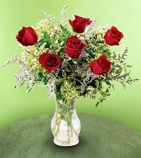 Old-fashioned becomes classic. Six red roses, with greenery in a glass vase