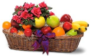 Fresh apples, bananas and pears, along with a potted red azalea, arrive in an wicker basket decorated