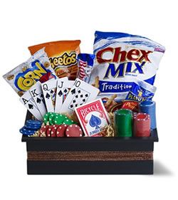 When you think of a classic poker night, what comes to mind? A "guys' night" of good friends sitting around a table, throwing down cards and chips and enjoying a tasty selection of snacks! If there's a man in your life who loves poker, this fun basket - filled with cards,NOTE (poker chips not included) and a selection of sweet and savory treats - is a great all-occasion gift.