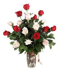 A romantic combination of soft pink and radiant red long stemmed roses delicately arranged with greenery in a charming clear glass vase.