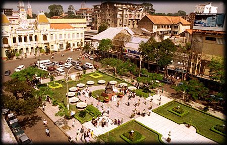 ![]() Like many cities in Vietnam, Saigon did not escape the wrath of war. Since the beginning, Saigon has had quite a traumatic history. There are many citations to the birth of Saigon and the origin of its name. In the 15th century, this area were swamps, marshes and thick forests. By the early 17th century, a small township was formed. According to one theory, Saigon or Sai Con has its root in a Khmer word Prei Kor (Kapok Tree Forest). The name Saigon was used officially in 1698, when Lord Nguyen Phuc Chu sent Mr. Nguyen Huu Canh to this region to create various districts and to form a government for this southern outpost. Because of its strategic location for trade and commerce as well as military importance, Saigon continued to grow and became a bonafide city. By 1772, Mr. Nguyen Cuu Dam began to fill many of the canals to form streets. In the mid 19th century, the French with the aid of the Spanish invaded this port city and destroyed the fort. This event was the precursor to the long struggle between the people of Vietnam and France leading to the historical defeat of the French in 1954. In the years after the defeat of the French, Vietnam was divided into two separate countries and Saigon became the hub of resettlement for many as people from north and central Vietnam immigrated south. In the 60's and 70's, Saigon was bustling with commerce and business. It was the cultural center and the capital city of South Vietnam. Already heavily influenced by the French in terms of culture and style, the city had an air of a French provincial town with a Vietnamese twist. Saigon was dubbed the "Pearl of the Orient" by the foreign press. The city was alive with activities and cultural diversity that rivaled any Asian city at the time. After the fall of South Vietnam to communism in 1975, the city and many of its inhabitants were in a state of chaos and turmoil. In 1976, the new government renamed the city Ho Chi Minh City and shut its door to the rest of the world. Although recognized world wide as Ho Chi Minh City, to the people of Vietnam, the city is still lovingly referred to as Saigon. With a population of over 7 millions people, Saigon is one of the densest urban area in the world. On many streets, it is common to see houses with the ground floor converted into a business front while several families share living areas on the upper levels. Common mode of transportation just a few years ago, the ubiquitous "cyclos" are becoming rare since they have been banned from many streets. Replacing them are fleets of taxis and "Honda ôm" - Japanese motocycles that you just wave down and jump on the back to be transported anywhere in the town. Unlike other cities in Vietnam, Saigon is very active at night. Music halls often play to sold-out local crowds and restaurants stay open late into the night. During the summer months, sidewalks are dotted with colorful fruit stalls. Ben Thanh market has long been one of Saigon's most famous landmark. The market has been in existence since the French occupation. The original market was located on the shores of Ben Nghe river by old fort Gia Dinh. Its proximity to the fort and the river where merchants and soldiers would land was reason for its name (Ben meaning pier or port and Thanh meaning fort). In 1859, when the French invaded Saigon and overtook fort Gia Dinh, Ben Thanh Market was destroyed. It was rebuilt shortly thereafter and remained standing until it was moved to its present location in 1899. Built on a landfill of what was once a swamp named Bo Ret (Marais Boresse), the new Ben Thanh Market is located in the center of the city. Under the French government, the area around Ben Thanh Market was called Cu Nhac circle (Rond point Cuniac), named after Mr. Cuniac, the person who proposed filling the swamp to create this area. The area was later renamed Cong truong Dien Hong. Proposed to be one of France's most ambitious project in Indochina at the time, Rev. Colombert laid the cornerstone for the cathedral on October 7, 1877. Three years later, in 1880, the cathedral was opened to the public. These two dates are inscribed on a marble placard in the cathedral.The bricks used to build the structure were shipped from Marseilles. Artisans from Lorin Company (Chartres, France) were commissioned to create the stained glass windows. The cost of construction was a whopping 2.5 million francs. In 1962, the Vatican gave the cathedral the title Basilique. Vinh Nghiem Temple Located on Cong Ly boulevard (or Nam Ky Khoi Nghia), Vinh nghiem is south Vietnam's most majestic temple. Construction of the temple was completed in 1971 after the design was drawn by Mr. Nguyen Ba Lang and associates. The ground floor consists of the library, the auditorium, and offices. The temple is located in a large parcel of land. On the left of the upper court yard stands a tower or the seven-level Avalokitesvara Stupa. Next to the tower hangs a large bell given to the temple by the Japanese Buddhists Sangha. Den Ngoc Hoang - Emperor of Jade Temple Located in Dakao, first district, the temple was built by Cantonese Buddhists who settled in Saigon in the 19th century. The architectural style is heavily influenced by the Chinese of southern China. The Taoist deity (Emperor of Jade) is enshrined here along with his 4 guardians (Tu Dai Kim Cuong). The major attractions to the shrine are the elaborate carvings of the various deities as well as its unique architectural style of the interior. This temple is also home to the Hall of Ten Hells where there are carvings of various scenes of the various levels of hell. Dinh Doc Lap - Independence Palace Dinh Doc Lap or Independence Palace was completed in 1966 after three years of construction. The plans were drawn by Mr. Ngo Viet Thu, winner of the architectural excellence prize in Rome. The palace was built on the original site of the French governor's headquarters in the 19th century. President Diem commissioned Mr. Thu to design the new palace