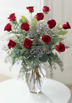 A traditional presentation of roses with limonium and greens in a glass vase
