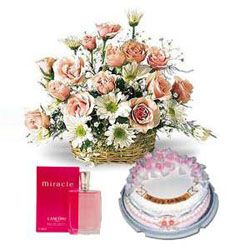 Make your beloved surprised with these special gifts. This package includes: A basket of pink roses, daisy and baby Miracle perfume for women 30ml A Duc Phat's cream & fresh milk cake: florist delivery to Ho Chi Minh City (Saigon).