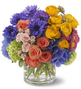 Pink roses and Matsumoto asters, light pink spray roses, purple anemone, blue hydrangea, yellow ranunculus and green viburnum are delivered in a glass cylinder vase