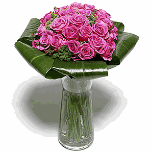 A stunning compact arrangement of classic pink roses and folded leaves.
