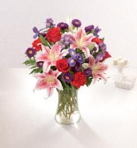 This elegant vased arrangement will catch their eye with its array of red roses, pink lilies, purple irises, purple aster and more