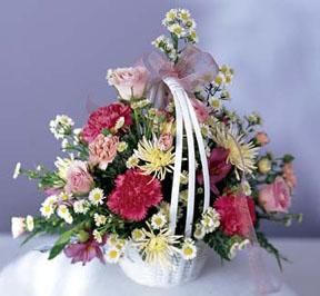 Send your warmest greetings and salutations. A clutch of vibrant pinks, creamy yellows and star-like whites, in a basket with pink ribbon.