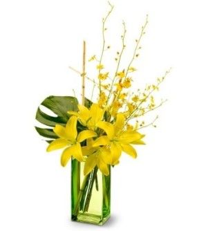 Yellow oncidium orchids and Asiatic lilies - accented with a philodendron leaf and river cane - are delivered in a glass Vase - Due to local market
