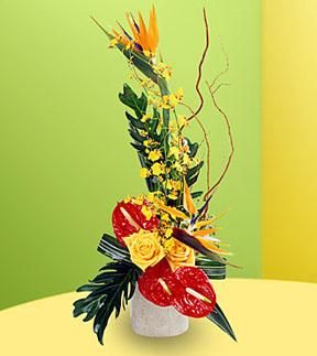 Birds of Paradise and red anthurium are the central focus in this distinguished floral design
