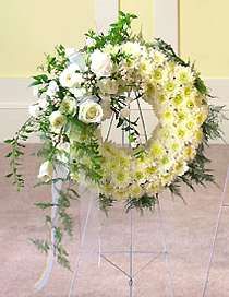 An all white wreath of roses, carnations and mums symbolizes eternal life. This beautiful wreath is always appropriate as a dignified remembrance to a devoted family member