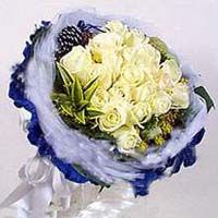 A round bouquet consisting of 20 white roses, bamboo, and beautiful greens wrapped with two layer of bouquet paper